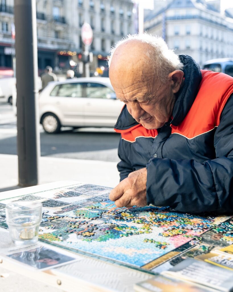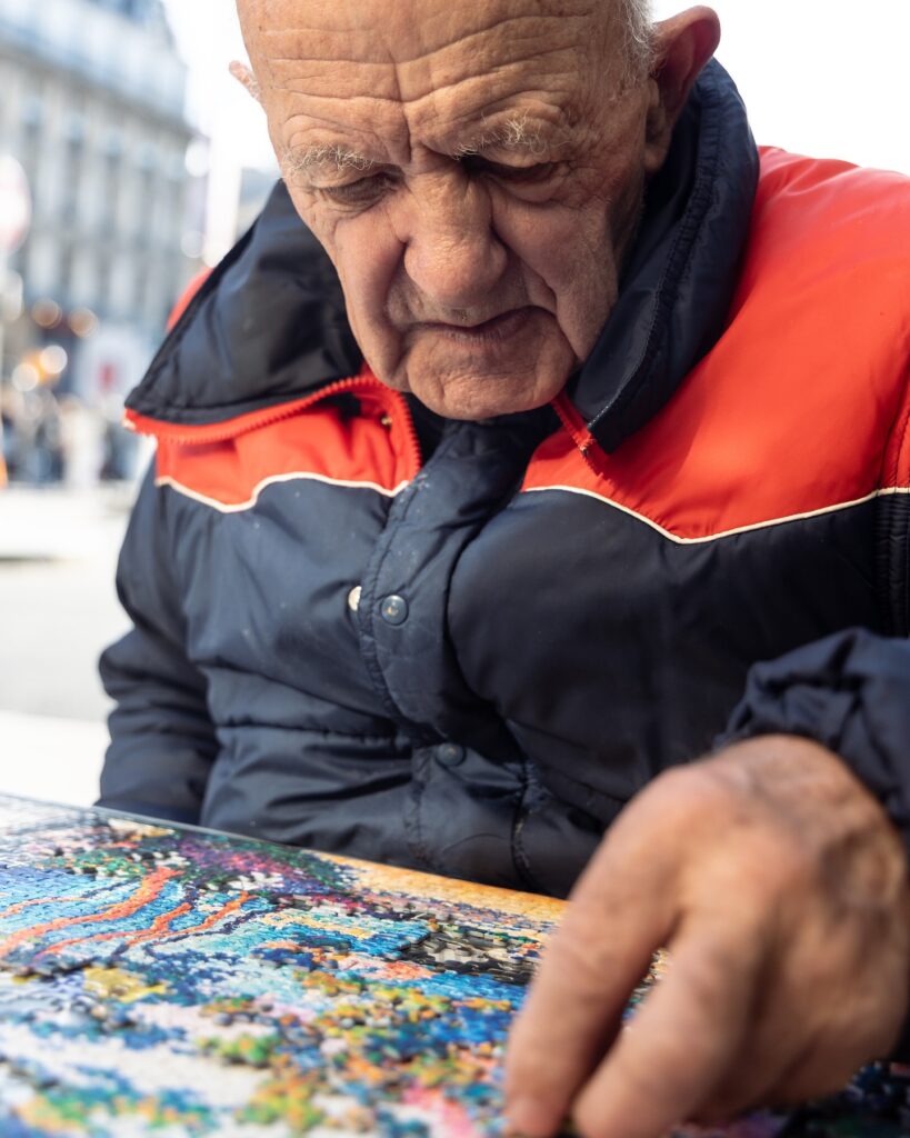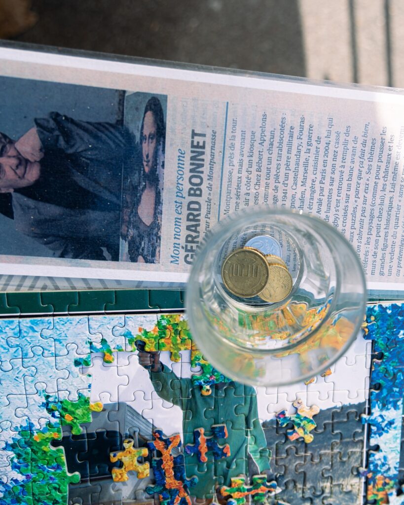 Συνάντησα τον κύριο Gerard Bonnet, ή αλλιώς «Monsieur Puzzle», σε μια από τις πρωινές μου βόλτες στη λεωφόρο Montparnasse στο Παρίσι. Εκεί, σε ένα μικρό τραπεζάκι, με μια σανίδα και μπροστά του ένα παζλ 500 κομματιών, καθόταν αυτός ο ζεστός και φιλικός κύριος, απόλυτα απορροφημένος στη συναρμολόγηση του παζλ του. Η εικόνα του, με την ηρεμία και την αφοσίωση, μου τράβηξε την προσοχή.